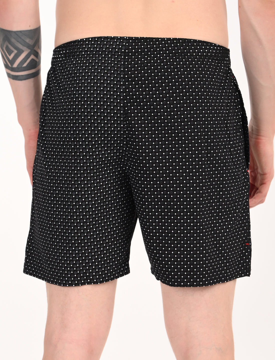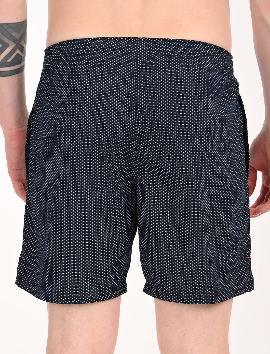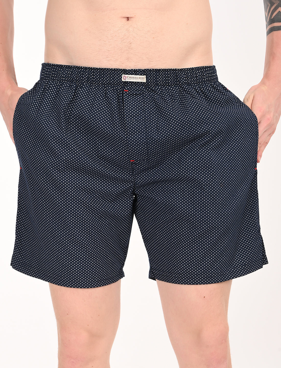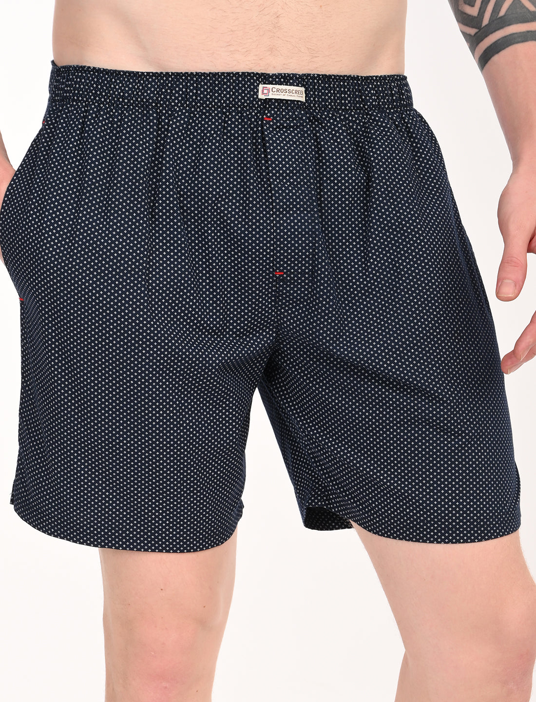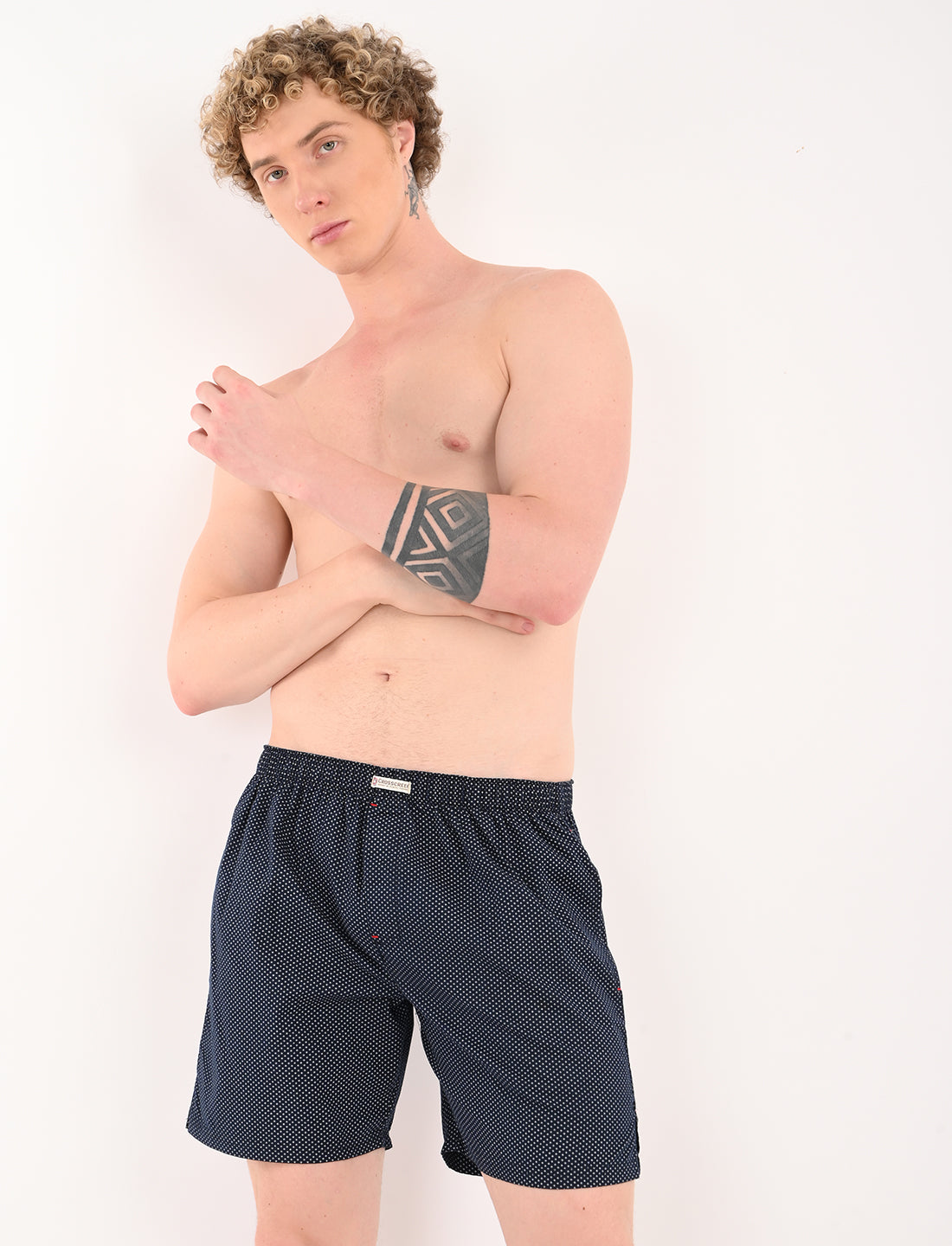 A navy boxer with small white diamond motifs, adding a touch of flair