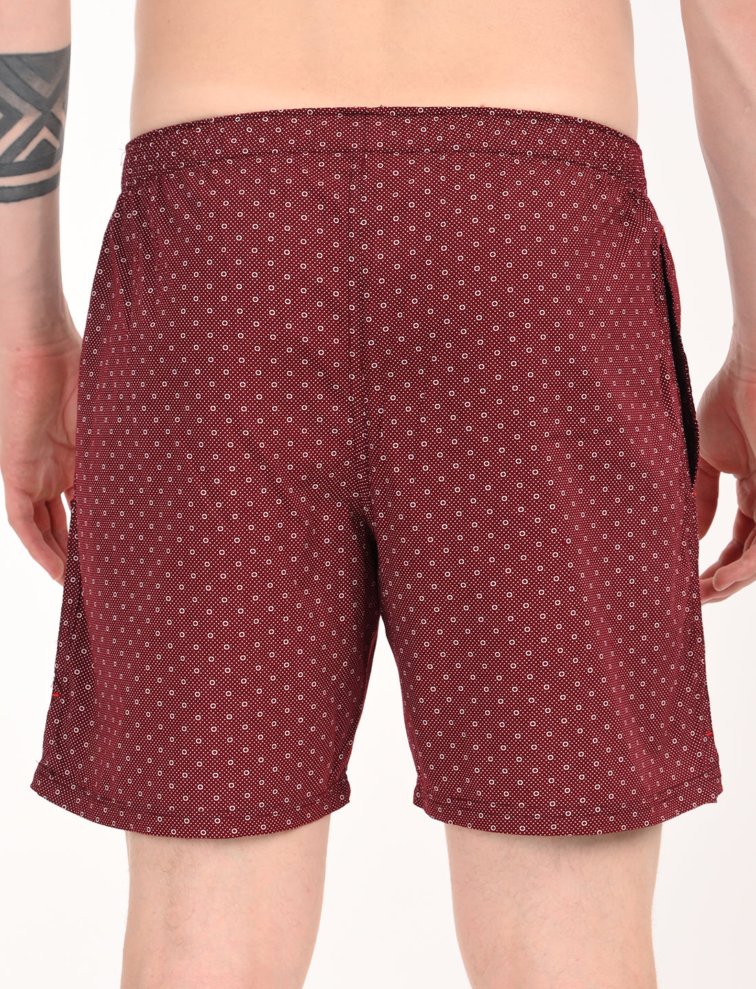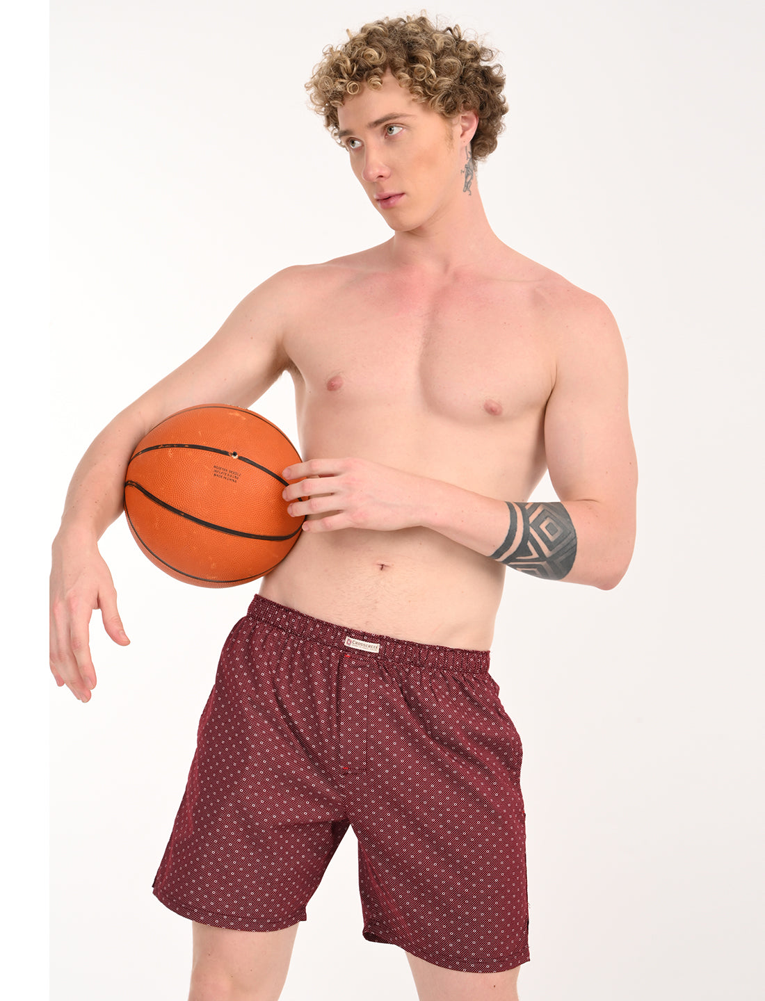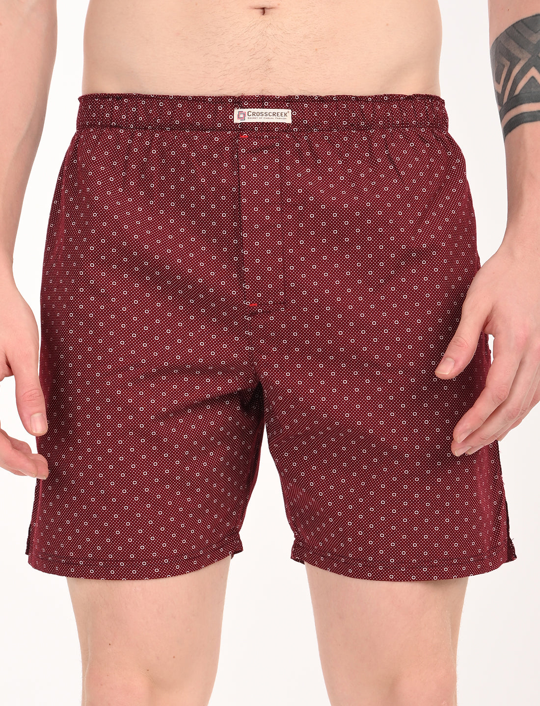 A rich maroon boxer with artistic circular dot pattern, bold yet wearable